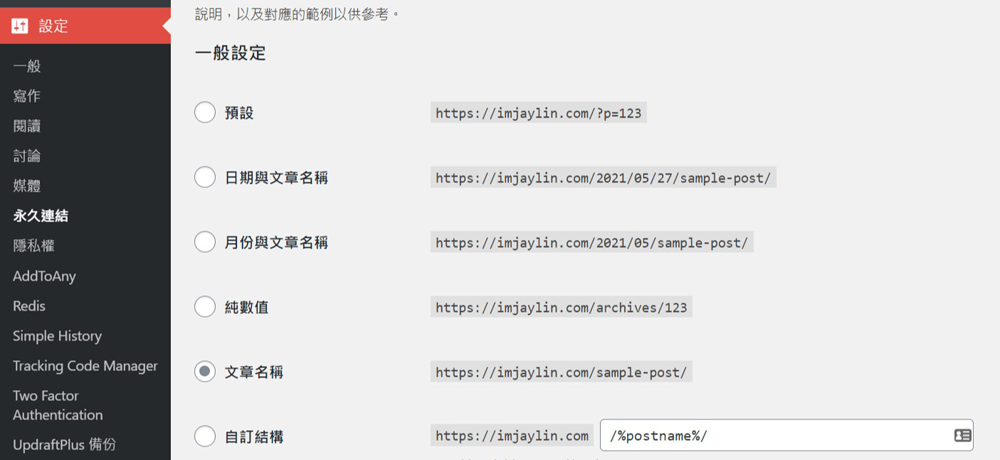 在"永久連結"中選擇"文章名稱",這個選項通常適用於大多數網站。