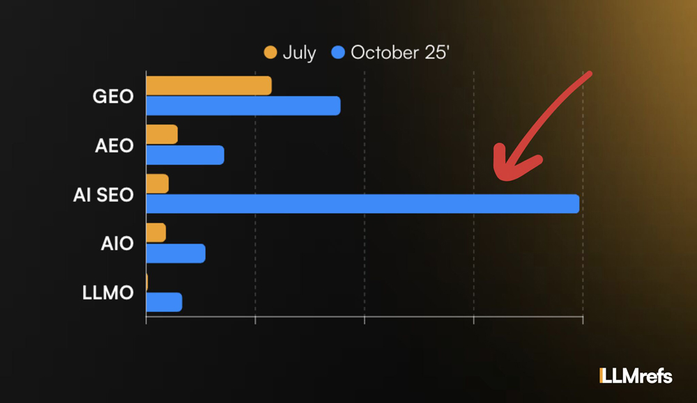 根據 LLMrefs 的統計數據顯示(根據 LinkedIn、Reddit 和 X 平台上的使用率):AI SEO 是被使用最多的名詞,其次才是 GEO。