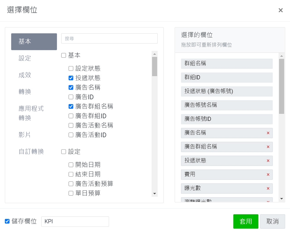 選擇好要加入的數據指標之後,下方可以勾選『儲存欄位』並命名欄位,最後再點擊『套用』。