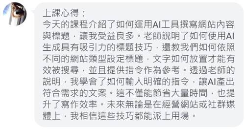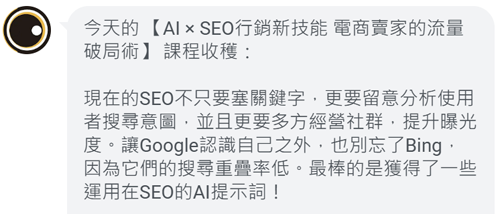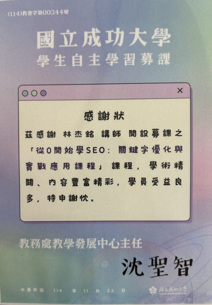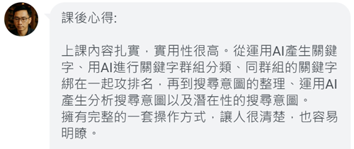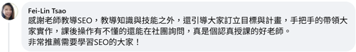 擔任 SEO 行銷講師的成就或樂趣之一,就是收到來自學員的回饋和認可,這讓我更能深切感受到自己在做一件有價值和對的事情。